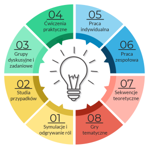 Szkolenia odbywają się w formie interaktywnych warsztatów doskonalących umiejętności i postawy. Tworzymy warunki do utrzymania stanu skupienia uwagi niezbędnego do uczenia się poprzez różnicowanie metod pedagogicznych.